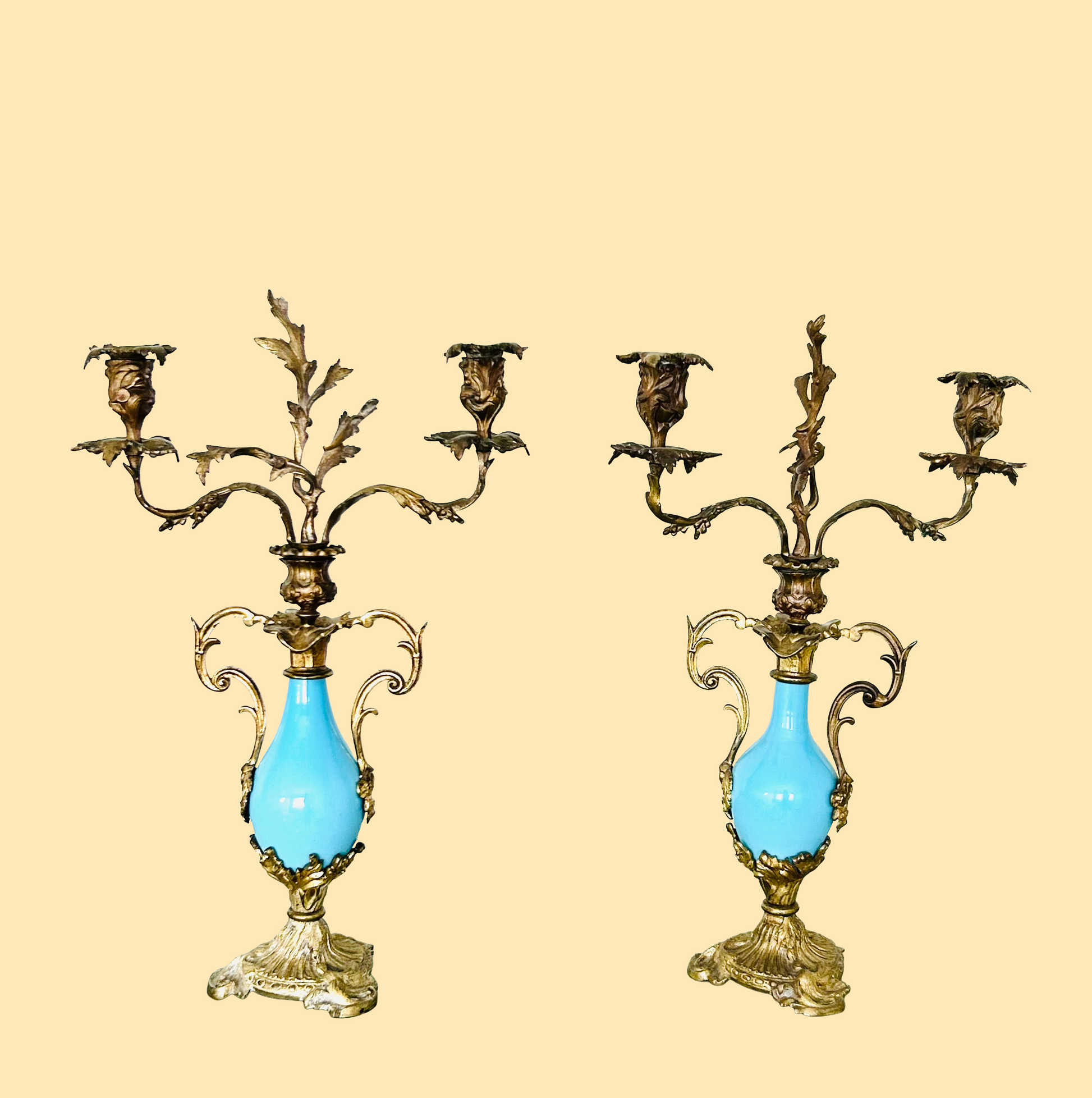 Ein seltenes und exquisites Paar türkisfarbener Porzellan-Kandelaber im Stil Ludwigs XV. aus dem 19. Jahrhundert, gefertigt von Thomas Abbott aus Birmingham . Die Kandelaber sind mit vergoldeten Metallbeschlägen versehen. Wunderschön modelliert und detailreich gestaltet, zeichnen sie sich durch zart geschwungene, vergoldete Arme und fein gegossene Rokoko-Ornamente aus, die auf eleganten Porzellanfüßen in leuchtendem Türkis ruhen.