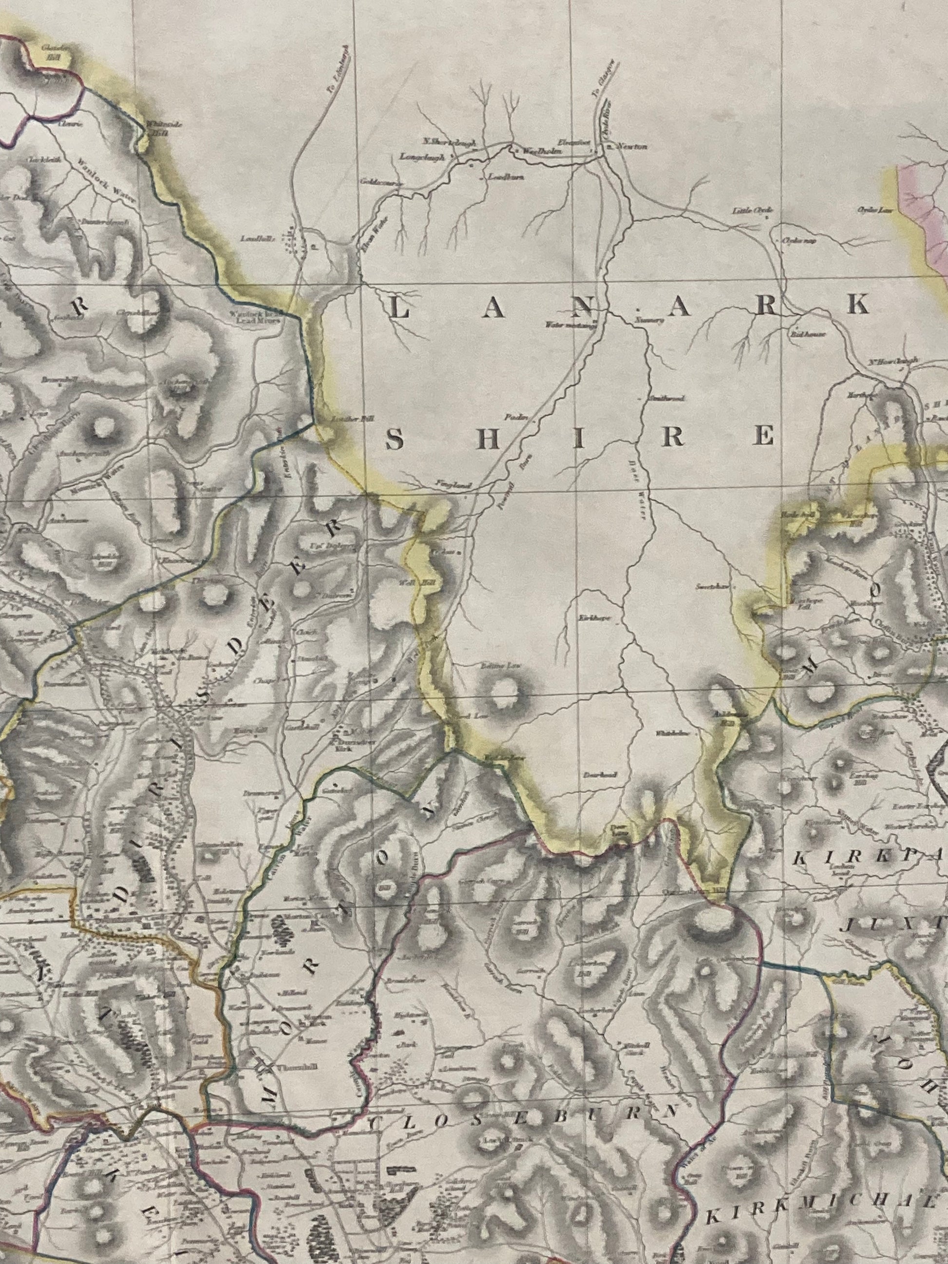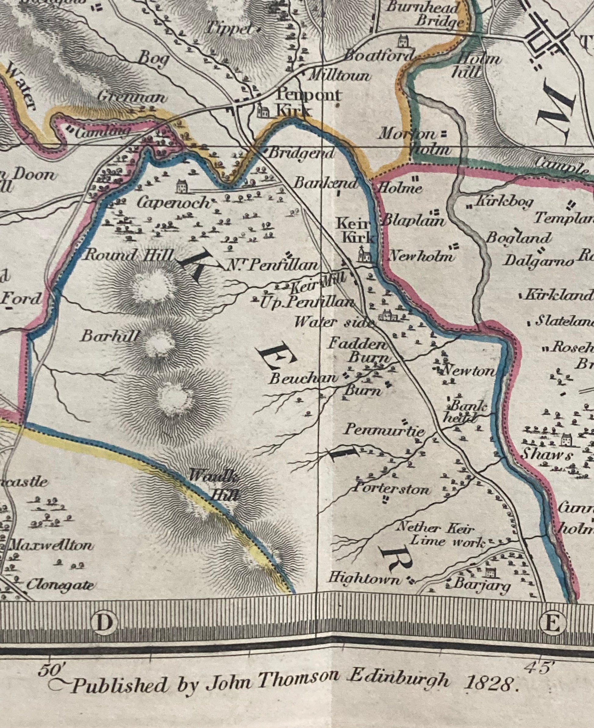 This beautifully engraved and hand-coloured county map captures the detailed geography and settlements of northern Dumfriesshire and surrounding shires of Peebles, Selkirk and Roxburgh.
