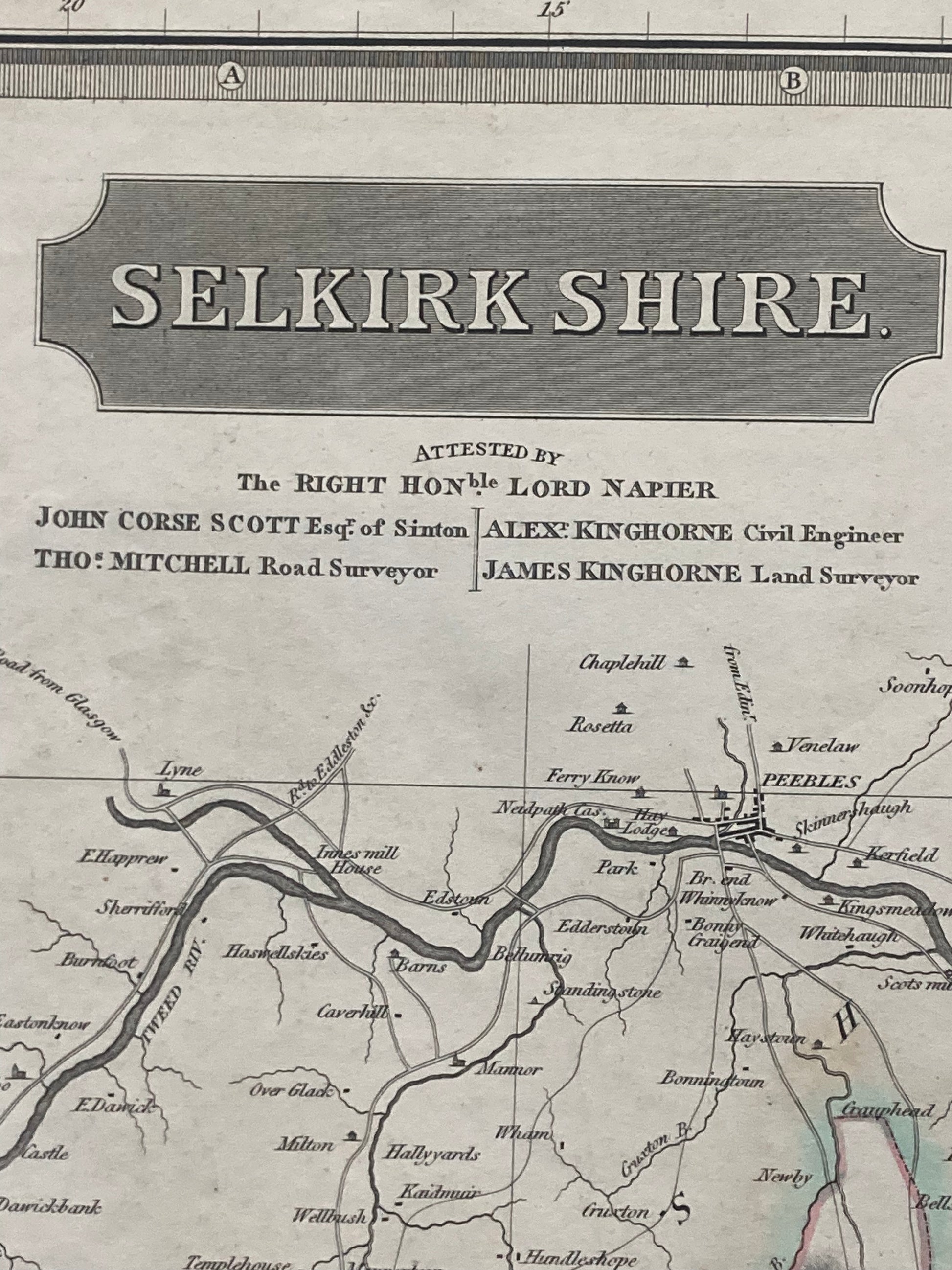 A large original antique map of the Selkirkshire, Scotland, published by John Thomson & Co., Edinburgh for the renowned “Atlas of Scotland” .