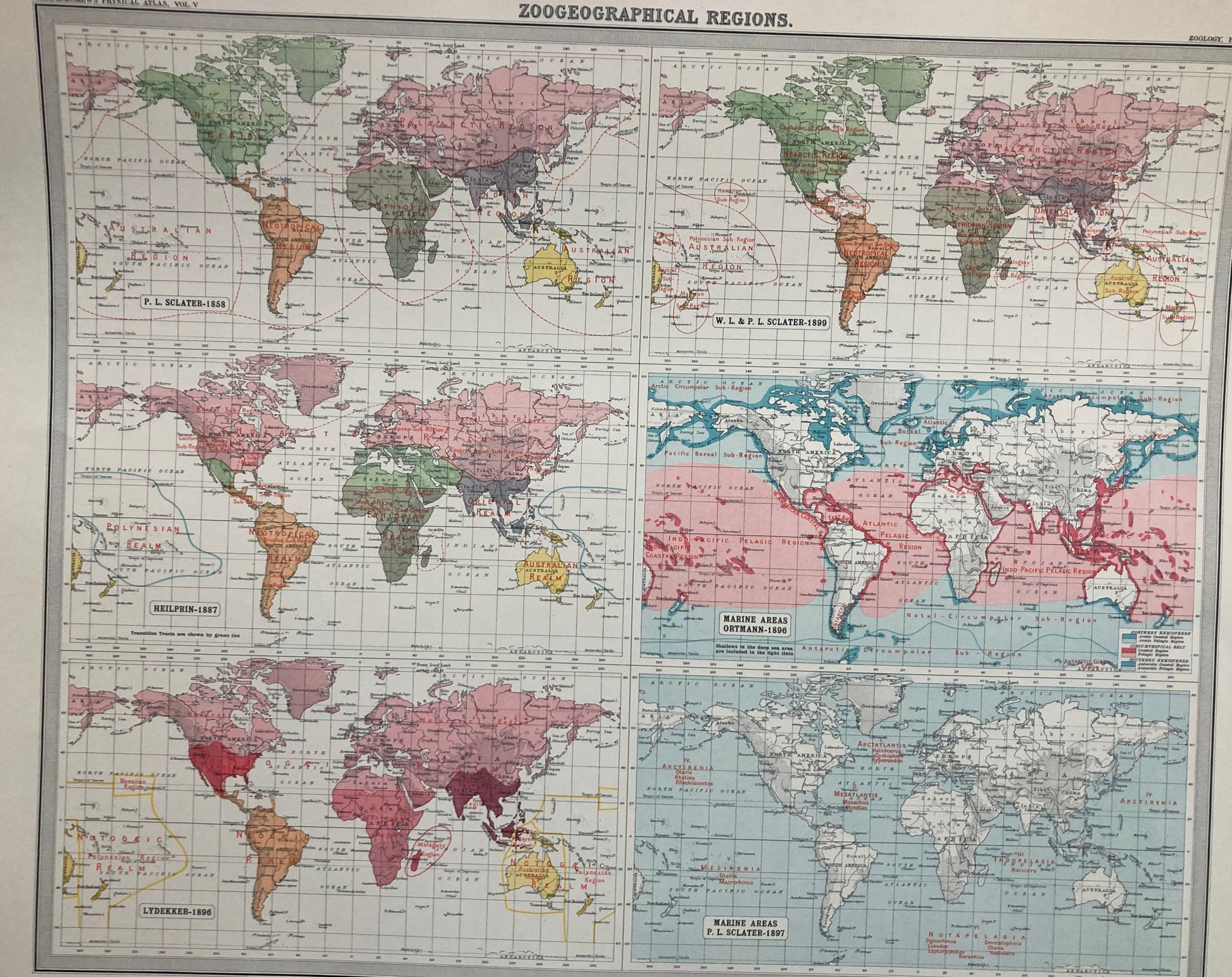 Step back in time with this rare antique zoogeographical map. A beautifully preserved educational chart dating back to the early 20th Century. Ideal for collectors, historians, and students, this vintage map showcases six scientific charts dating from 1858 -1899.