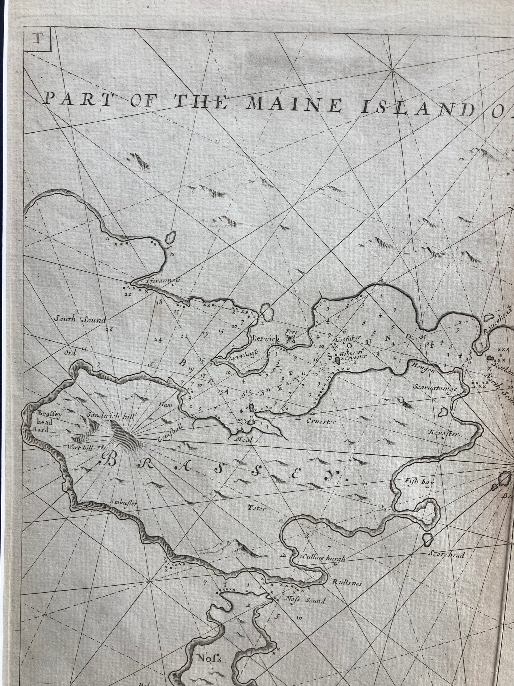 Part of the Maine Island of Shetland: Rare antique sea chart of the Shetland Isles by Capt. Greenville Collins, from Great Britain’s Coasting Pilot ( published 1693–1764). Historic maritime map.