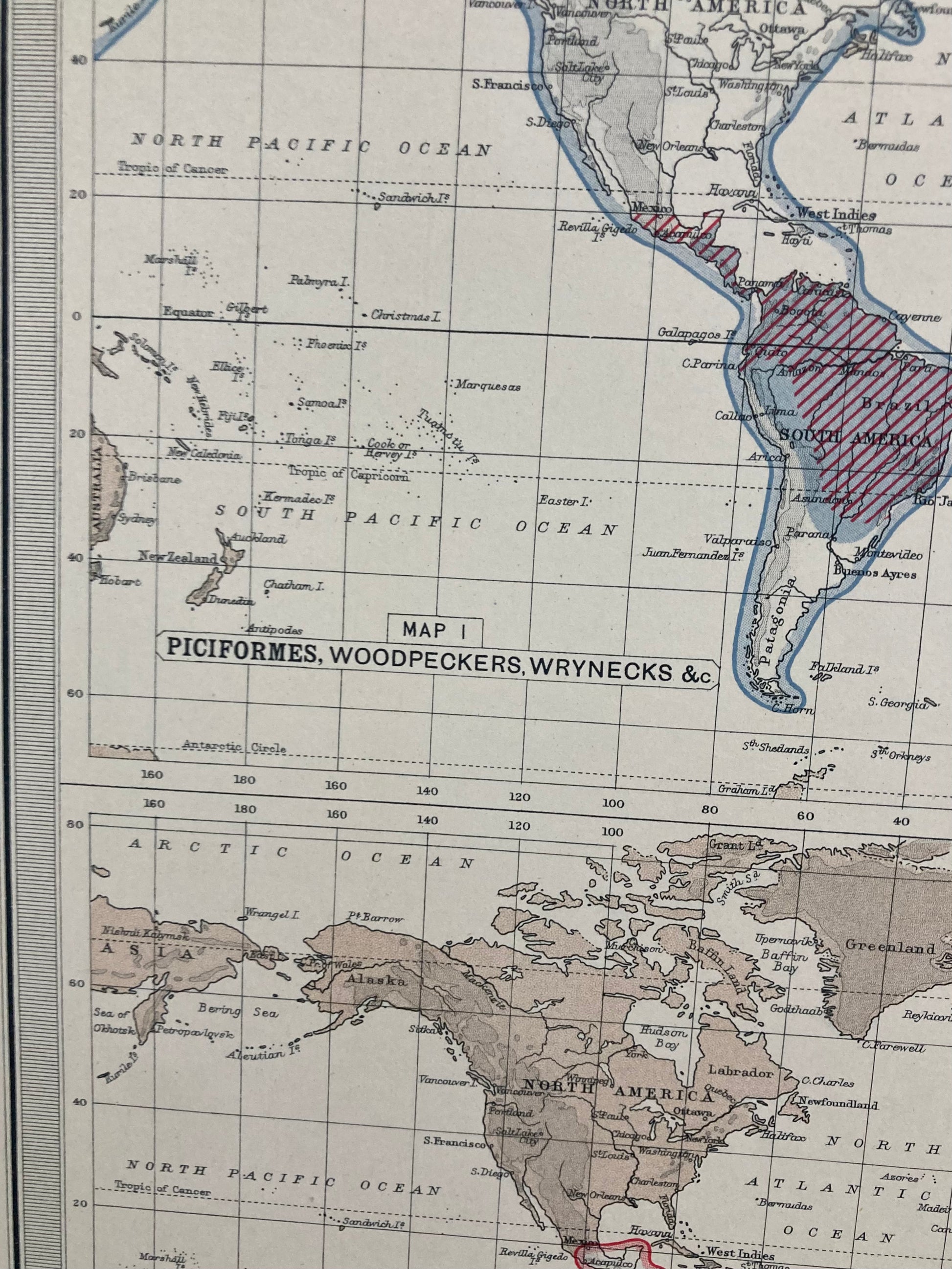 Step back in time with this rare antique zoogeographical map. A beautifully preserved educational chart dating back to the early 20th Century. Ideal for collectors, historians, and students, this vintage map showcasing distribution of types of perching birds throughout the continents. (Toucans, Hornbills, Kingfishers, Woodpeckers etc.)