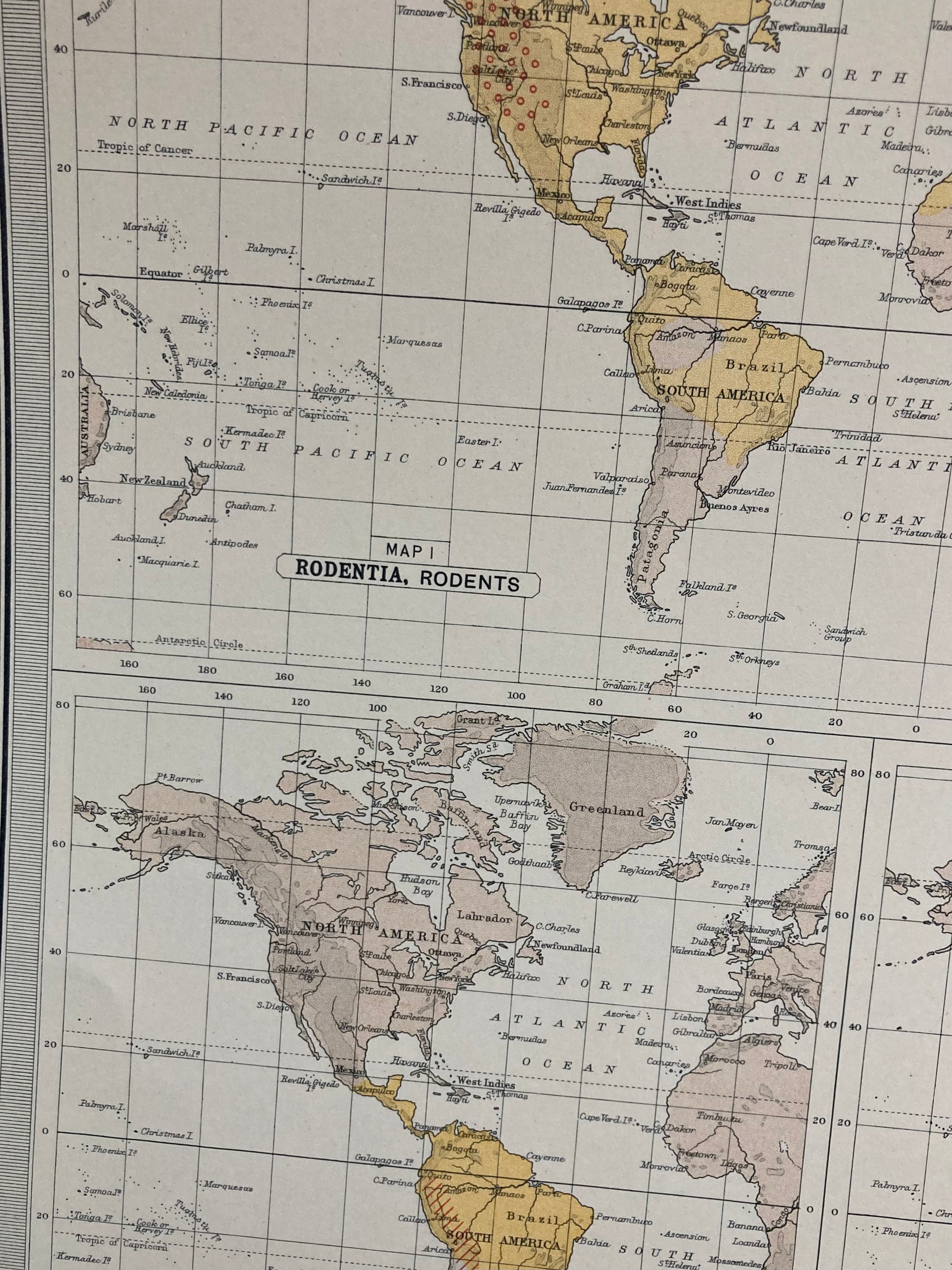 Step back in time with this rare antique zoogeographical map. A beautifully preserved educational chart dating back to the early 20th Century. Ideal for collectors, historians, and students, this vintage map showcasing distribution of rodents throughout the continents.