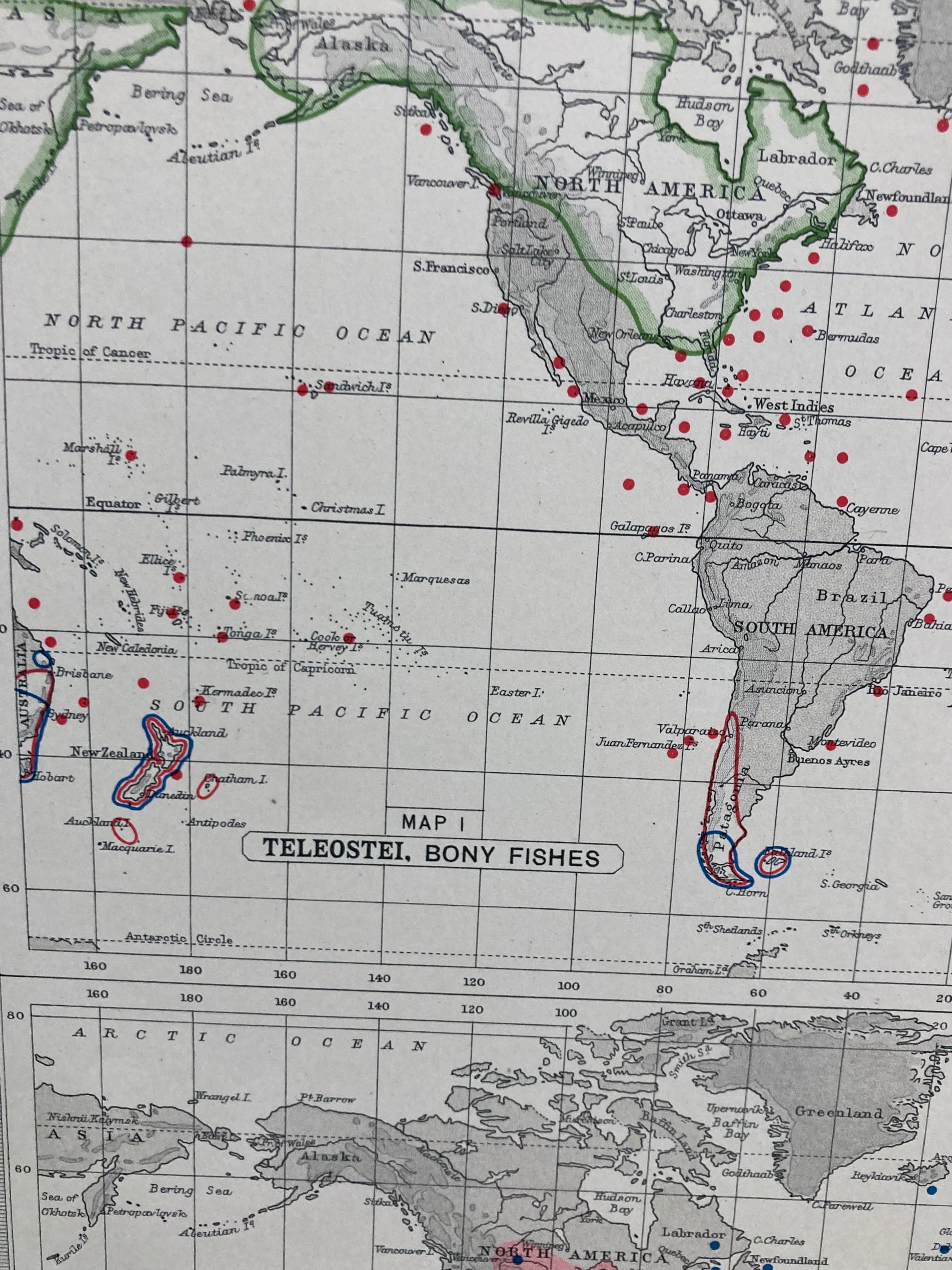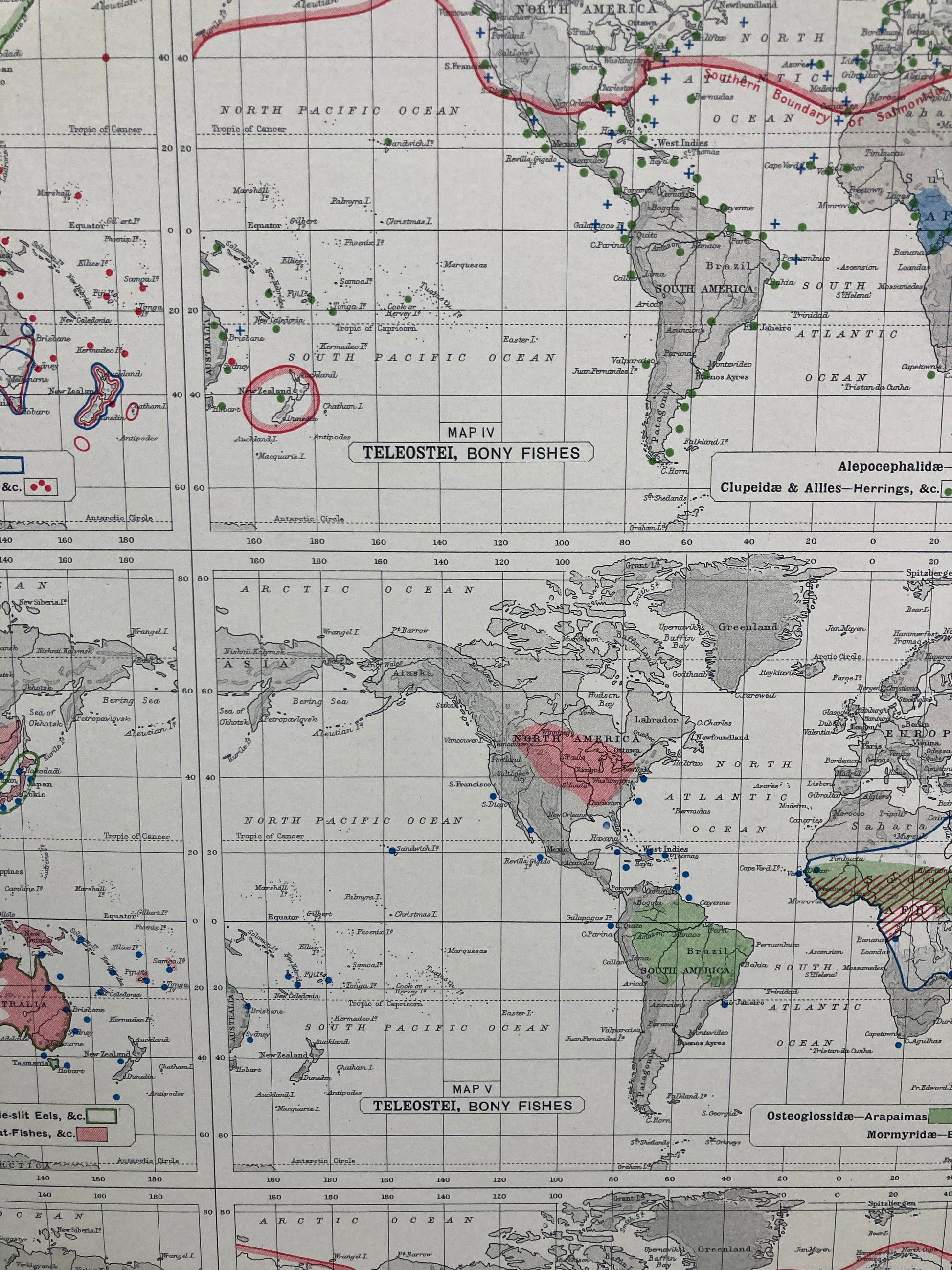 Antique Zoogeography Map - PICES - BONEY FISHES – Vintage Zoology Chart,Early 20th Century